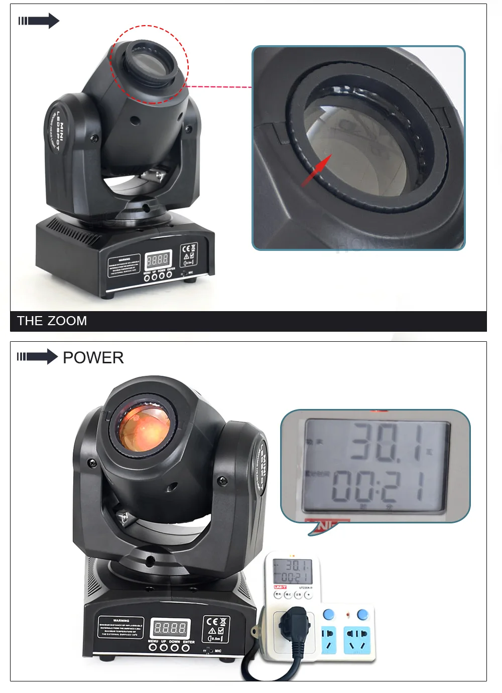 - Высокопроизводительная мини-вращающаяся головка с ярким белым светодиодным источником мощностью 30 Вт